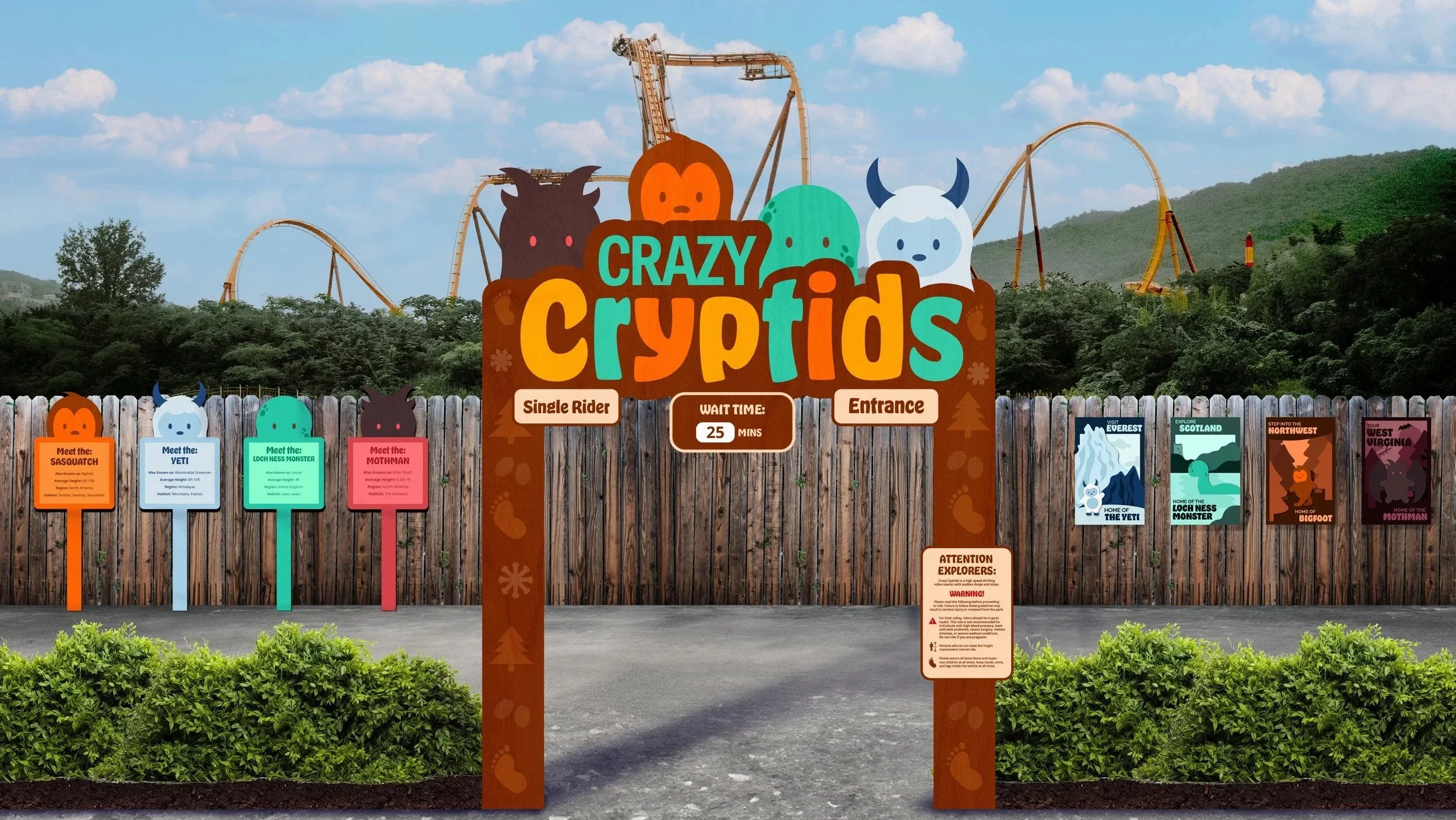 The entrance sign features the four creatures (HDPE) placed behind the wordmark. The sign includes four main components of information: single rider, wait time, entrance, and a warning sign. In addition, there are symbols representing each creature down each leg of the sign which would be printed on plywood.