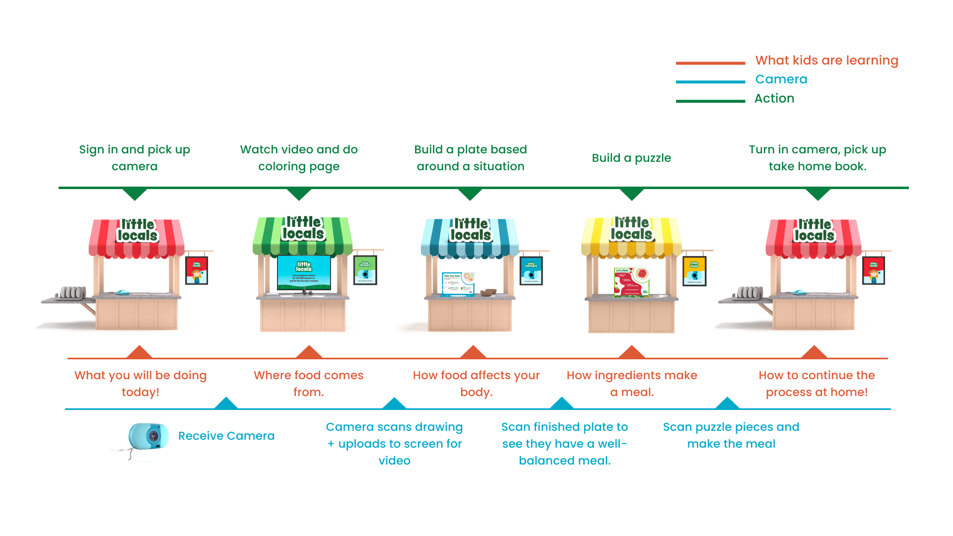 A service that is sold to farmers markets that sets up booths with activities for kids. The kids play and use an interactive camera to learn about where their food comes from, how food affects their bodies and emotions, and how ingredients make a meal.