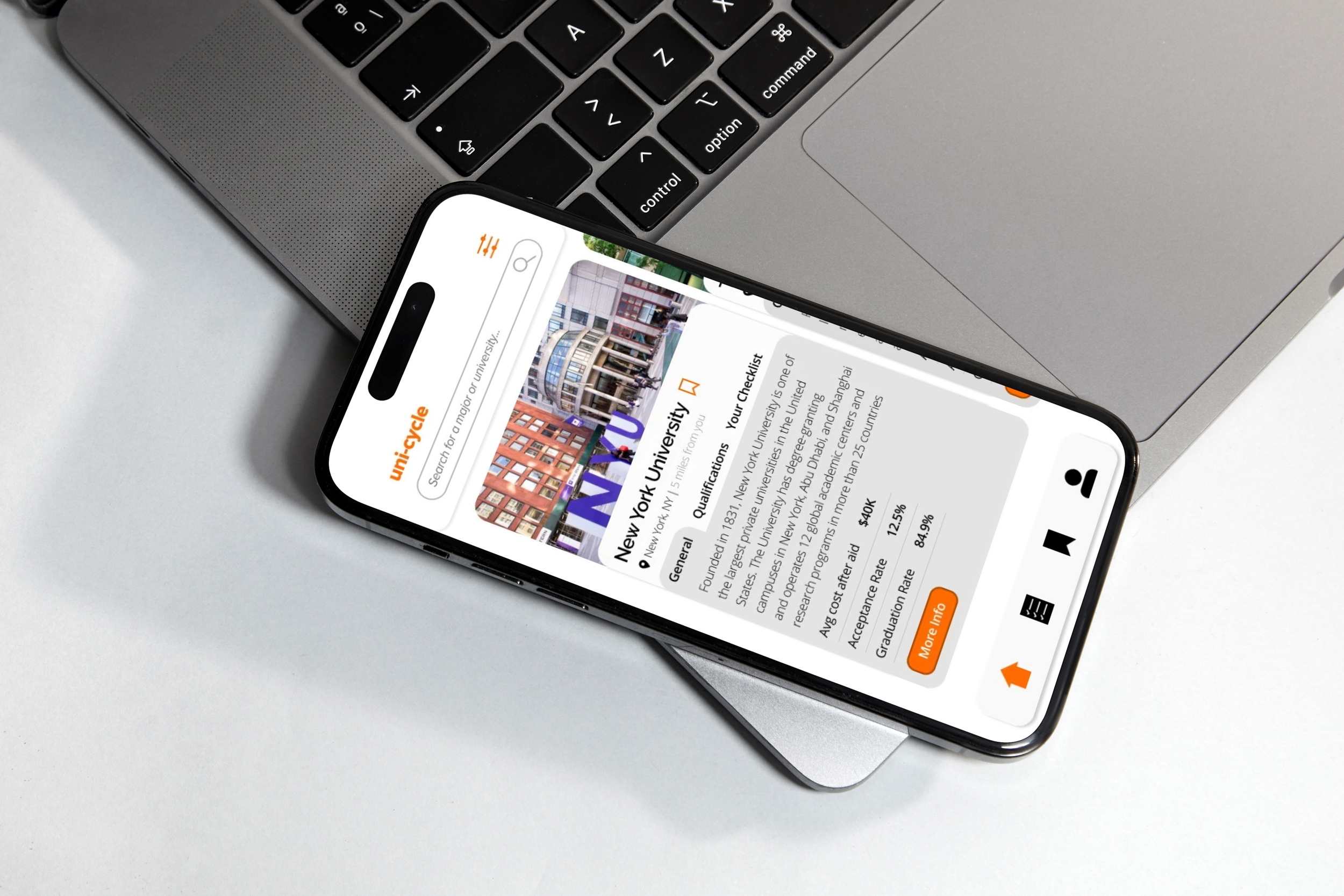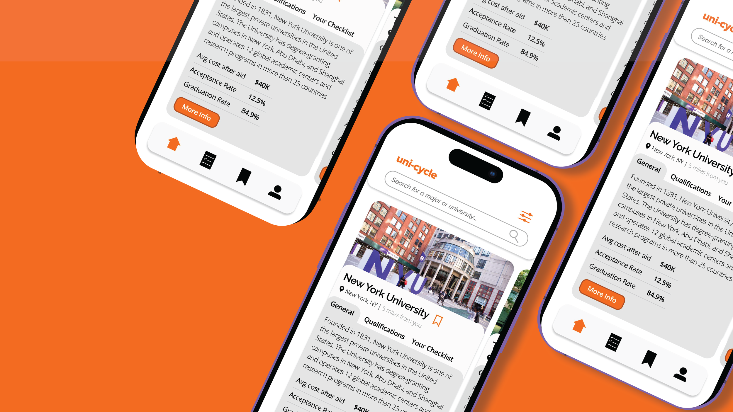 You’re about to graduate high school! Now what? Uni-Cycle will guide the user in a personalized process of the college search. Allowing for them to find their perfect college match all in one place.